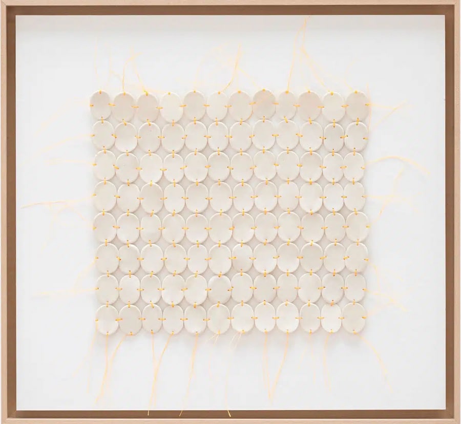 La céramiste présente un corpus d’œuvres murales dans lesquelles elle tisse des milliers de pastilles de porcelaine à l’aide de fils, créant ainsi une trame délicate de liens, de mémoire et de matière.