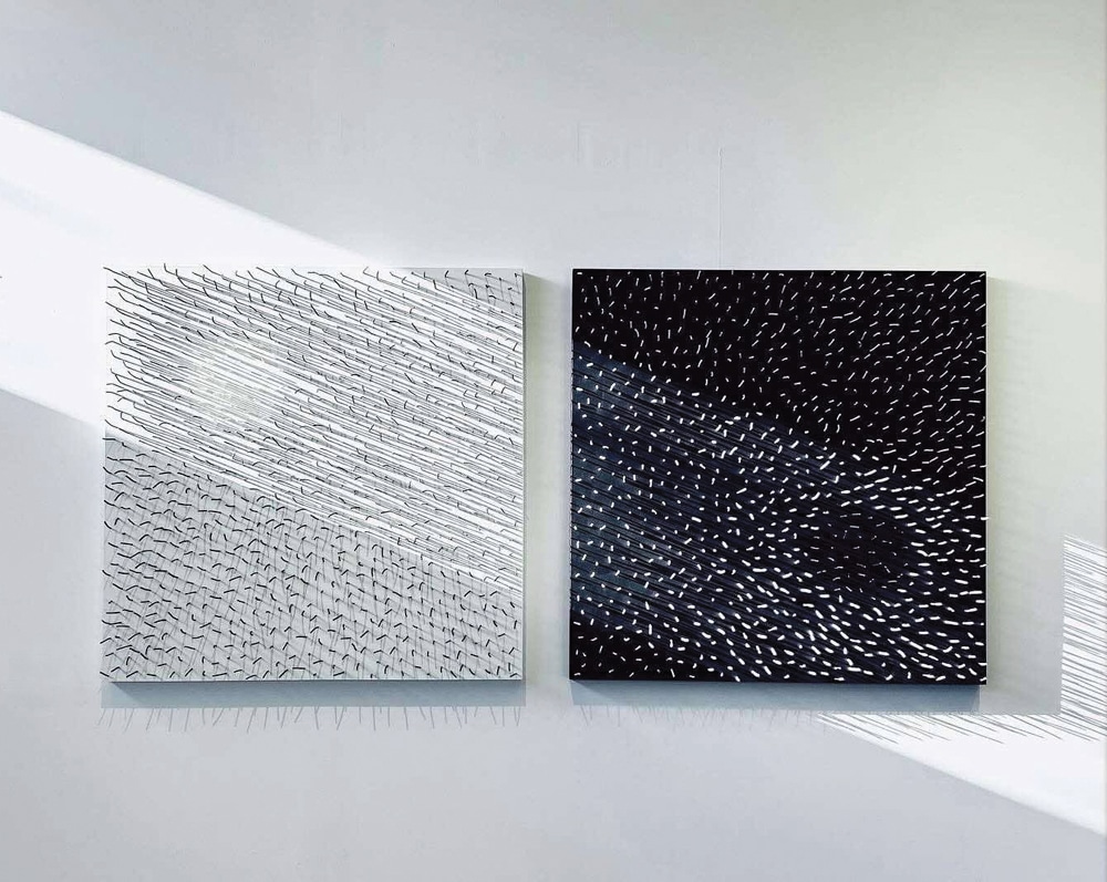 Nils Fluck, Bing and Bang, 2025, 2 fois 91,4 x 91,4 cm. Fils électriques restants des rénovations à la galerie Blanka, acrylique sur panneau