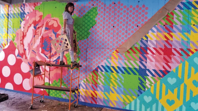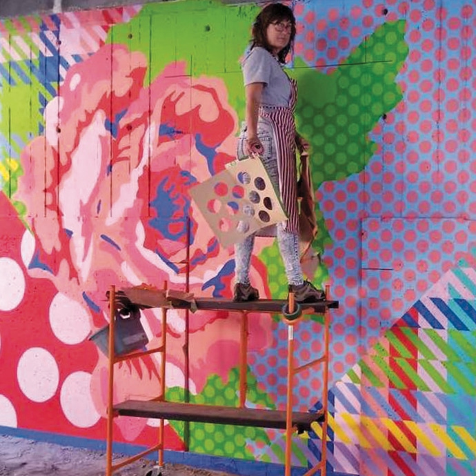 Karina Jacobsen devant sa nouvelle murale à l’école secondaire Massey-Vanier.