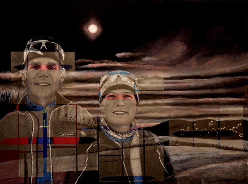 Night Skiing, 2023, crayon de graphite sur papier, fragments de photo, acrylique sur bois, 40 x 30 po.