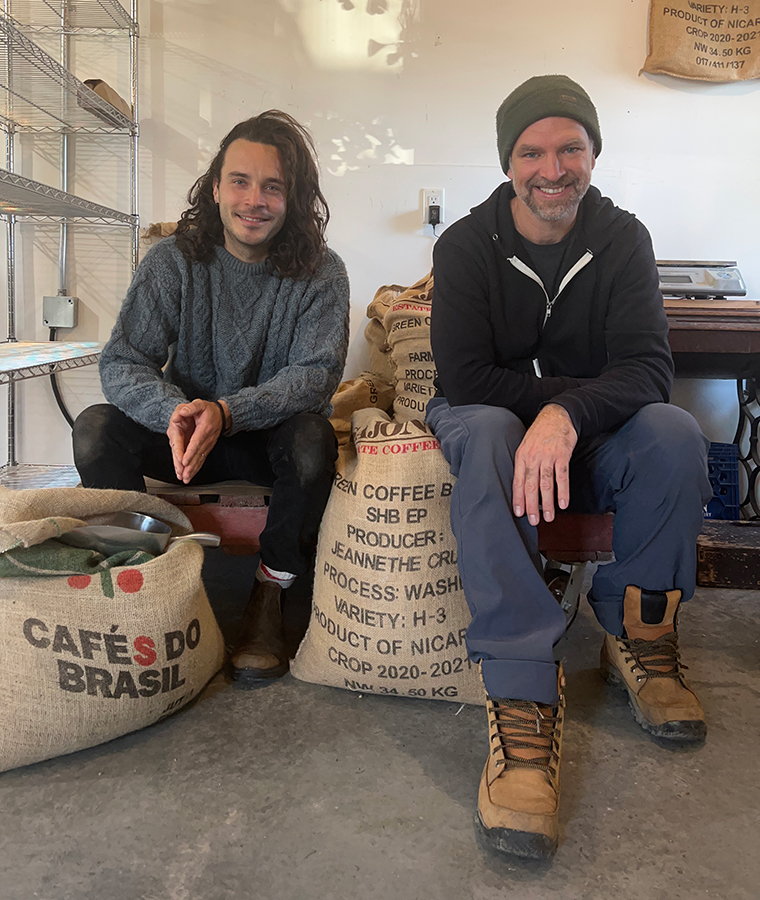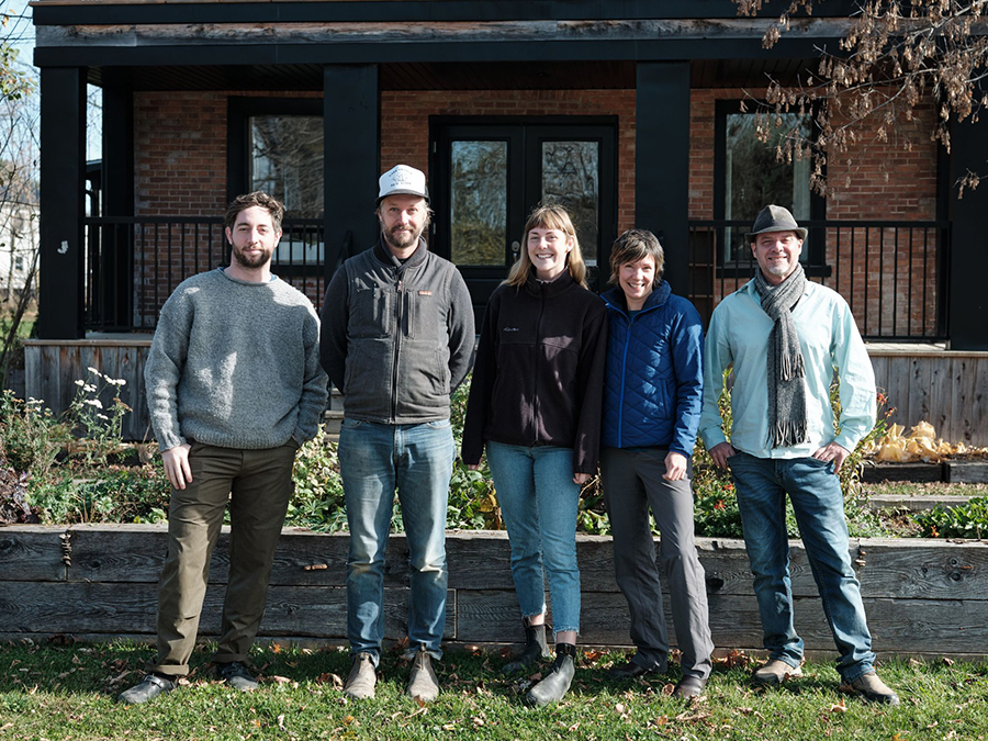 Éric Gendron, chef, Jean-Martin Fortier, co-propriétaire, Jeanne Santoire-Joset, coordonnateur.ice et cuisinier.ère, Caroline Longpré, gestionnaire et maître-d’hôtel et Philippe Tapp, co-propriétaire. Photo : Alexandre Chabot