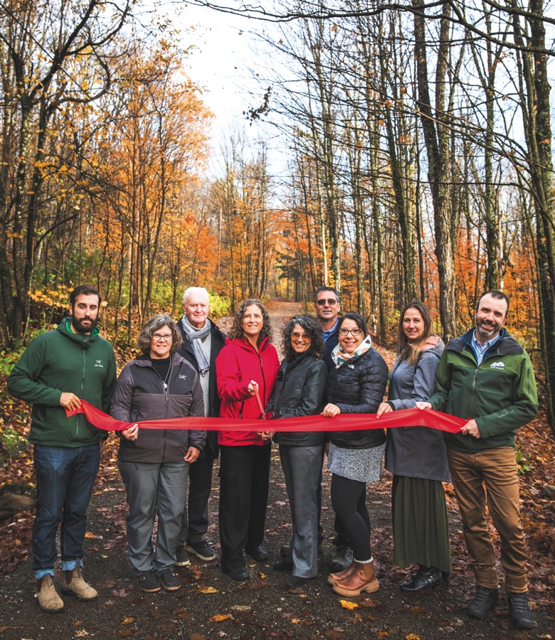 Légende photo : Coupe de ruban lors de l’événement de dévoilement du Circuit Westwood (de gauche à droite : Jeremy Lachance (PENS), Lydia Phelps (CDES), Robert Benoit (Ville de Sutton), Janna Hubacek (CDES), Johanne Gauvin (bureau de Madame Isabelle Charest), Yvan Giroux (Ville de Sutton), Heidi Vanha (CDES), Caroline Cusson (Ville de Sutton), Jonathan Fortin (Ville de Sutton).