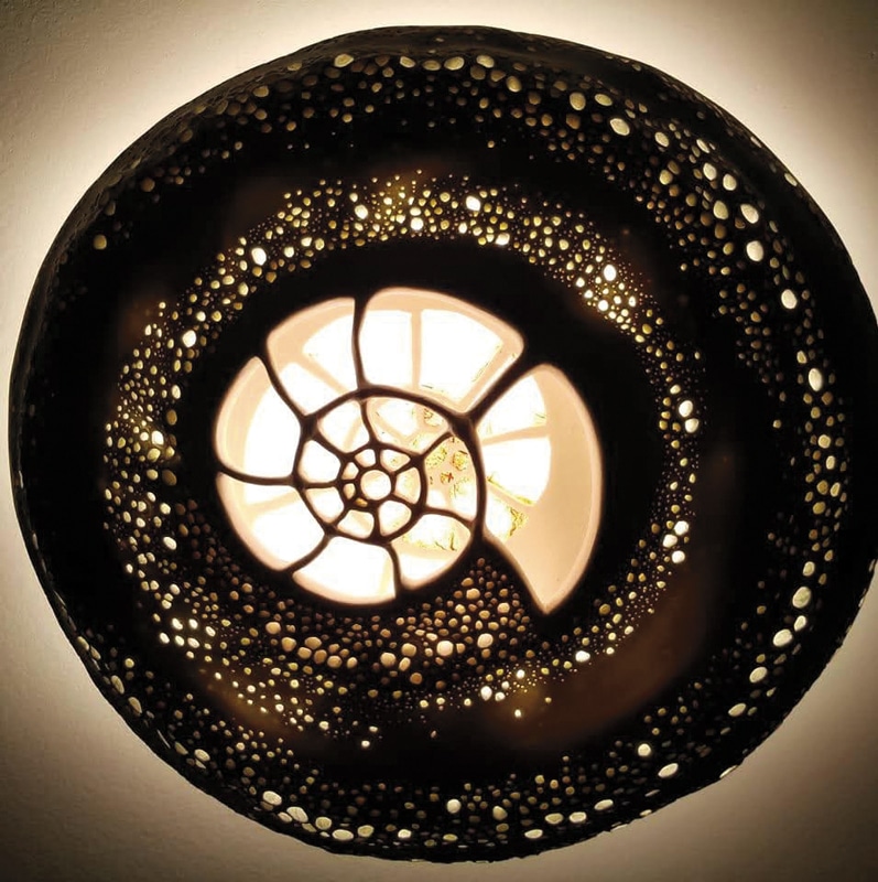 Miryam travaille avec l’argile japonaise qui possède une armature formée par le papier et qui n’a pas besoin de cuisson. Elle y ajoute des morceaux de vitrail qui jouent avec la lumière. C’est un travail de moine : elle perce minutieusement, un à un, une multitude de petits trous afin de laisser passer la lumière.